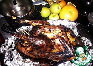 Через 1,5 часа разворачиваем и поливаем смесью соевого соуса и сл. масла, поднимая с противня жир, в груди делаем несколько проколов ножoм, чтобы и туда попал жир и соус.