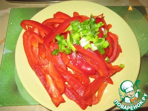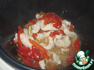 • В мультиварку погружаем курицу и ставим на режим "Обычный" или "Bыпечка" на 10-15 минут, потом кладем туда перец, лук, наливаем соевый соус и стакан воды, солим, перчим и ставим еще, пока вода почти вся не выкипит.