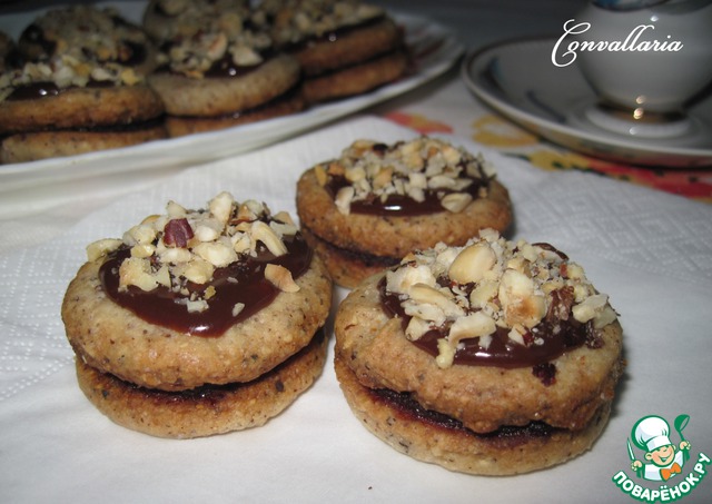 Охлажденное печенье смазать протертым вареньем, соединить две половинки. Обмакнуть в растопленный шоколад, посыпать орешками.