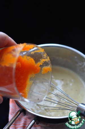Если у вас нет готового пюре, то тыкву нарезать мелкими кубиками и отварить 15 минут на парУ. Смолоть в блендере.