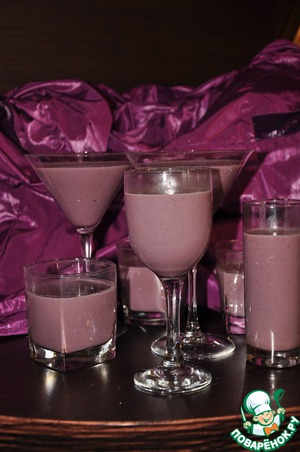 Добавить разбухший желатин. Поставить подогреваться. Виноградное пюре разбавить водой по вкусу, понасыщенней, чем покупной сок. Разбавить нужно обязательно, а то будет терпко. Виноградную часть тоже немного нагреть и 500 мл смешать с молочной. Прогреть, убедиться, что желатин растворился. НЕ доводите до кипения! -