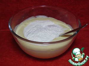 Аккуратно перемешаем взбитые белки с желтками, только потом добавим муку и разрыхлитель и нежненько размешаем.