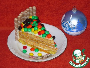 Предлагаю к Новому году нежнейший бисквитный тортик со стружкой из свежей моркови, со сметанно –лимонным кремом, украшенный конфетками в форме конфетти. Этот торт украсит Ваш Новогодний стол. Самые яркие воспоминания о Новогоднем празднике, конечно, детские. В начальных классах на уроках ритмики нас учили танцевать. К празднику с девочками разучивали танец «снежинок». Мамы шили нам платья из нескольких слоев марли, крахмалили их и украшали снежинками и дождиком. Мы счастливые и довольные порхали в этих платьицах вокруг елки. Дорогие шоколадные конфеты на нашем столе были только по праздникам. Самым большим праздником был Новый год. Мама с папой приносили с работы по три подарка. Часть конфет мама развешивала на елке и просила нас, детей, до праздника их не трогать. Но мы хитрили и, чтобы не расстраивать маму, доставали аккуратно конфетки из обертки, а фантики продолжали висеть на елке, создавая иллюзию целой конфетки. Мама, конечно же, догадывалась обо всем, но никогда нас за это не ругала.