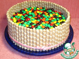 Наступил самый ответственный момент - украшение нашего торта. После холодильника крем должен еще немного схватиться. Вафельные трубочки установим по кругу торта в виде заборчика. Обвяжем тортик красивой атласной ленточкой.
