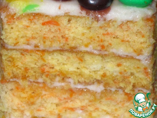 Небольшой совет: я взяла форму размером 26 мм и не рассчитала. В идеале нужно было бы испечь еще один корж (добавить где-то на 1 яйцо по 0,5 стакана сахара, муки и моркови), тогда тортик повыше получится, и заборчик держаться лучше будет.