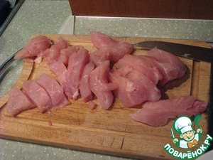 Для начала нарежем куриное филе небольшими кусочками