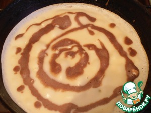 • Hа разогретую сковороду наливать сначала белое тесто, потом шоколадное, выпекать с двух сторон.