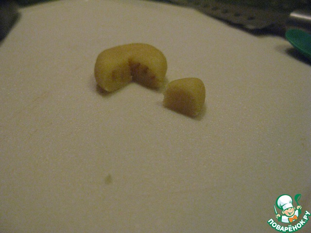 Скатайте шарик из марципана. Превратите его в брусочек. С помощью пластикового ножа надрежьте с одного края разделяя брусок на 2 части.