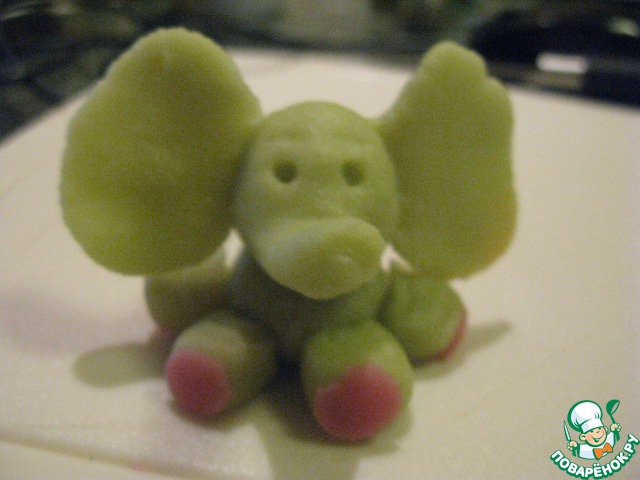 Слепить из салатового марципана туловище в виде шарика и ножки в форме маленьких толстых колбасок. Мелким предметом нарисовать на них складочки в виде полосок. Прикрепить их к туловищу. -