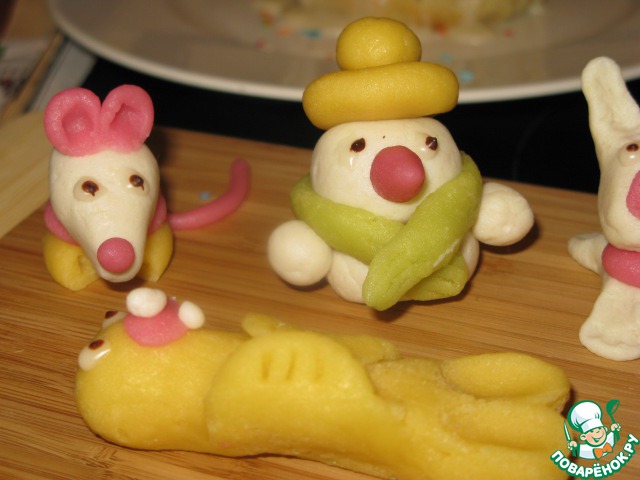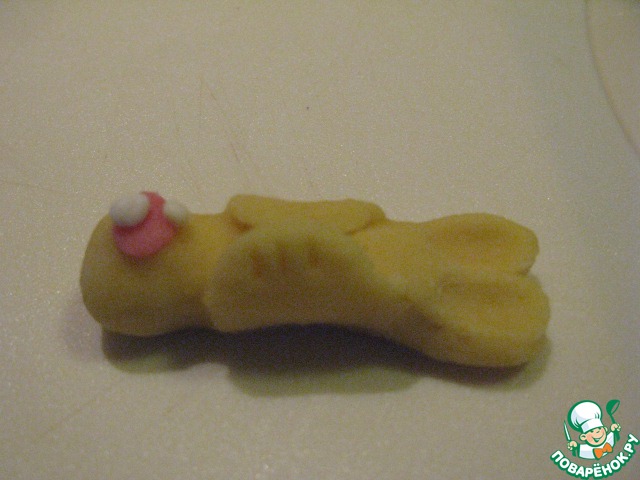 Зайчик: Скатайте из марципана небольшой шарик, сделайте из него небольшой брусочек. С помощью специального ножа надрежьте брусочек с двух сторон. Путем нажимания на марципановую массу придайте конечностям с двух сторон брусочка форму лапок. -