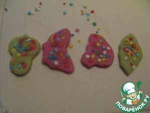 У меня ещё остался марципан и я сделала из него что-то вроде игрушек на ёлку: раскатала его и с помошью формочек для пластилина вырезала фигурки.
