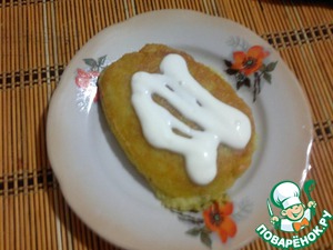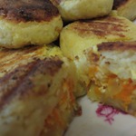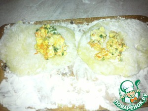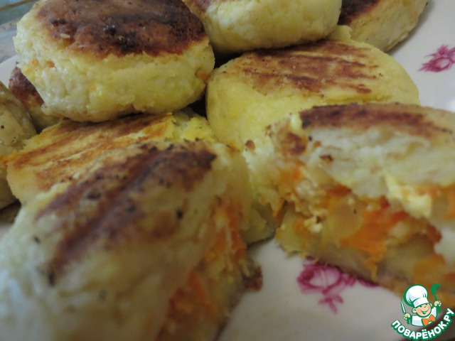 Руками, выкладывая пюре на ладонь, формовать толстые лепешки, выкладывать сверху начинку, складывать лепешки пополам, защипывая края, панировать в муке, затем обжаривать лепешки на сковороде с разогретым маслом.