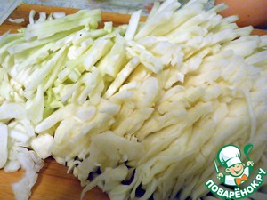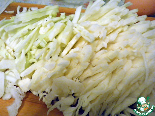 Пока варятся яйца, нашинкуем тонко капусту и перетрем ее с солью. -