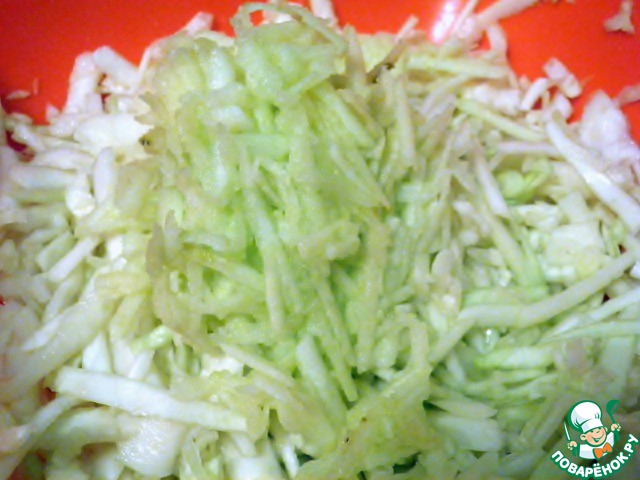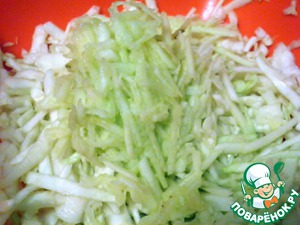 Добавляем яблоки к капусте, перемешиваем и ставим в прохладное место на 10-15 мин. Холодильник или балкон вполне подойдут. -