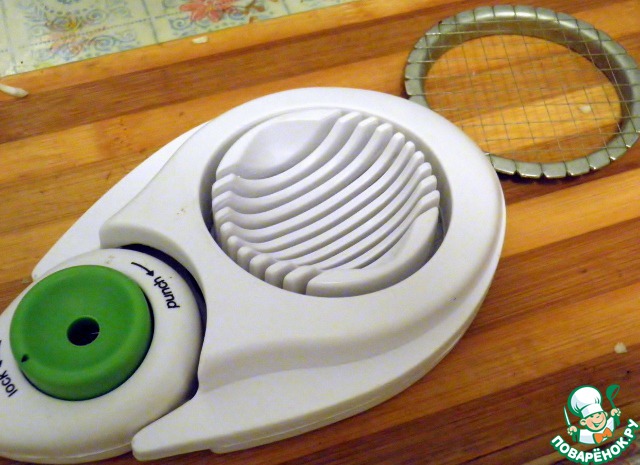 Тут не могу не похвастаться, купила недавно себе две такие штучки и теперь нарезка яиц занимает у меня, буквально, минуту. Правда, так увлеклась процессом, что забыла сфотографировать сам результат, но, думаю, как выглядят нарезанные яйца, знают все :) -