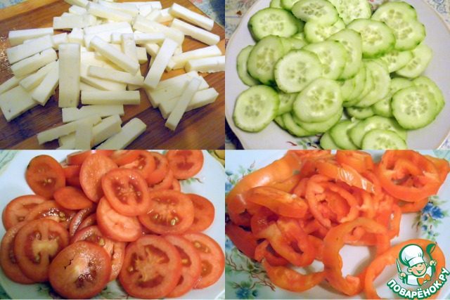 Все овощи моем. Огурцы чистим, а болгарский перец избавляем от сердцевины и семечек. Огурцы и помидоры режем тонкими кружочками. Болгарский перец - кольцами. Кстати, что касается болгарского перца, если нет красного, можно взять любой другой. Красный рекомендую в чисто эстетических целях.