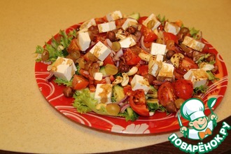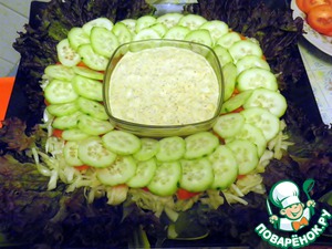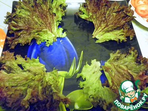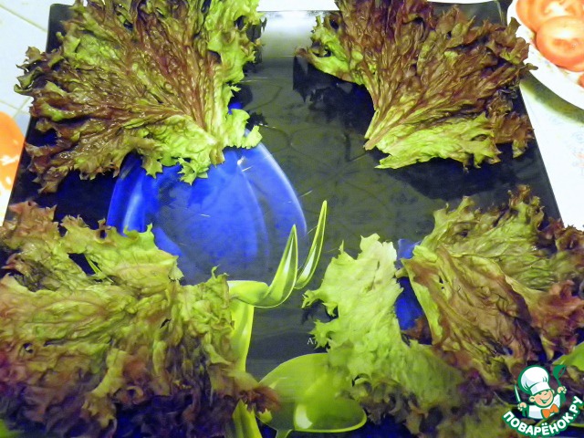 Салатные листья помыть и обсушить. Выложить на край блюда. -