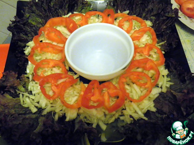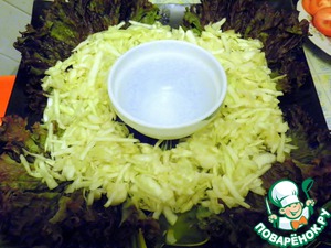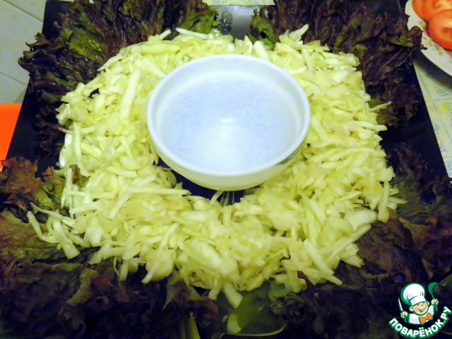 На салатные листья по кругу выкладываем капусту с яблоком. При необходимости немного досолите.
