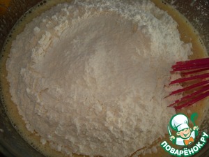 Потом добавляете муку, смешанную с солью, разрыхлителем и содой.