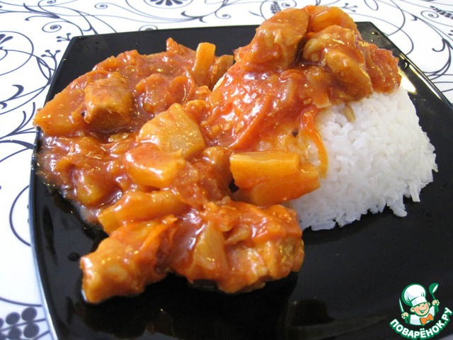 В это время делаем соус: в мисочке смешиваем ананасовый сок, кукурузный крахмал, кетчуп, уксус, чеснок, карри, соль и коричневый сахар. Попробуйте соус, если надо, подкорректируйте его на ваш вкус (может, вам захочется больше уксуса или сладости).