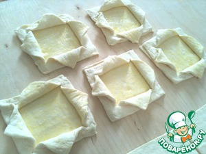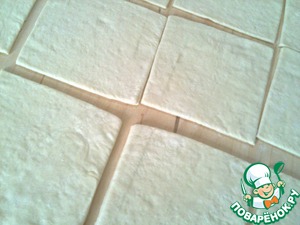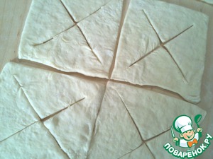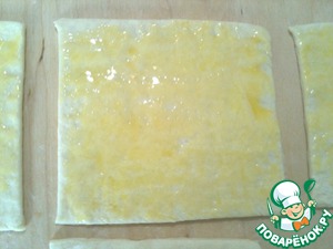 Слоеное дрожжевое тесто разморозить. Раскатать его в прямоугольник толщиной 0,3-0,5 см. Порезать на равные квадраты размером примерно 8х8 см.