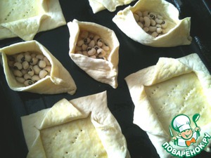 А можно просто сделать в виде лодочки. Для этого два противоположных края смазать желтком (обязательно, чтоб не разошлись при выпечке). Сделать лодочки, дно наколоть вилкой и насыпать немного фасоли, чтоб не вздулись и сохранили форму. -