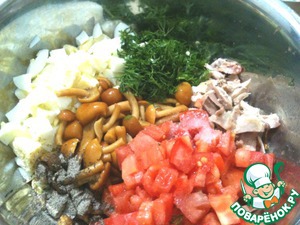 Я сделала тарталетки с салатом. Куриную грудку, яйца отварить. Порезать на маленькие кусочки, также мелко порезать помидор (сок слить), зелень. Посолить, поперчить, добавить маринованные опята и майонез. Все хорошо перемешать.