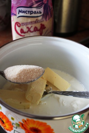В кастрюлю вливаем сливки, кладем сливочное масло и сахар. Ставим на плиту и доводим до кипения и растворения масла, помешивая.