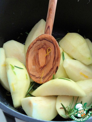 Груши положить в кастрюлю. Также туда лимонную цедру, сок и розмарин добавить. Проварить 1 мин. Снять с огня и оставить так остывать.