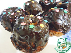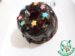 Для глазури растапливаем в маленькой кастрюльке масло сливочное, сахар и какао, варим около минутки и поливаем наши маффины. Украшаем по желанию, у меня кондитерская посыпка цветочками. По-моему, мило))