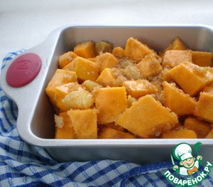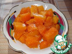 На противень или в форму выложить тыкву и поставить на 20-25 минут в духовку. По истечении этого времени выделится много сока, достать форму, слить сок в чашку, а тыкву снова отправить в духовку на 10-15 минут. -