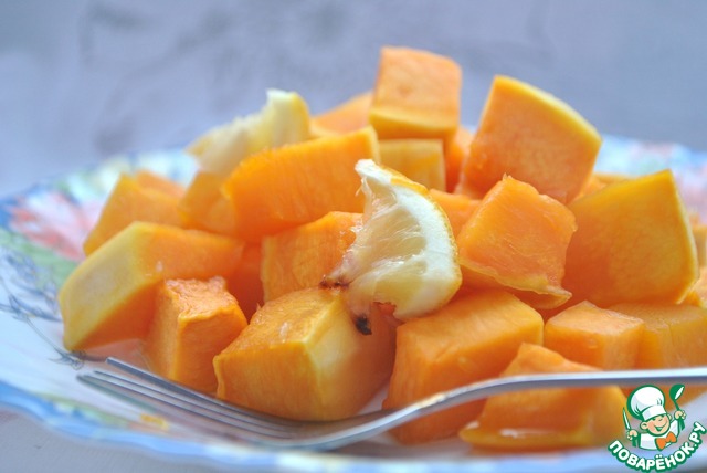 Всё, что необходимо сделать, это очистить тыкву и лимон от шкурки, нарезать на кусочки. Добавить коричневый сахар, именно коричневый, он придаст карамельный вкус, все перемешать.