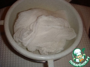 За 10-12 часов до приготовления крема выложить сметану в марлечку, выложенную в дуршлаг, сложенную в 4 слоя, и прикрыть сметанку краешками марли. Дуршлаг установить в миску и поставить в холодильник. -