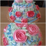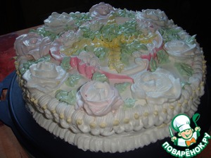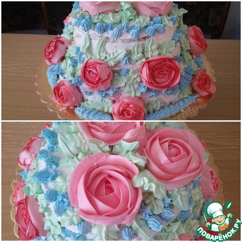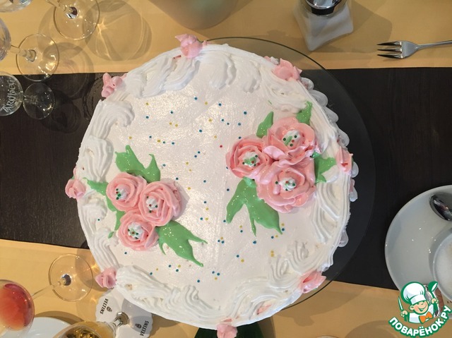 Торт из теста на сметане со сметанным кремом и украшенный белковым кремом. Тортик из пропитанных сметанным кремом коржей, сверху украшенный белковым кремом. Несмотря на очень сладкий белковый крем для украшения, за счет сметанного крема внутри получается совсем неприторным. Очень приятный на вкус и оставляет такое запоминающее, какое-то необычное послевкусие. Мне очень захотелось украсить как-нибудь торт именно из нежирного белкового крема, но долго не могла решить, какой будет сам торт внутри. Хотелось, чтобы не было очень приторным. Вот я и придумала такой вариант сочетания теста и кремов. Нам понравилось!
