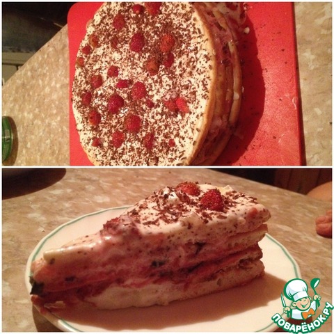 Украшением заморачиваться не стали, и времени сливать сметану не было. Зато украсили свежей клубникой с грядки и в крем добавили для цвета, жимолости. Результат превзошел все ожидания. Тесто теперь в списке любимых.