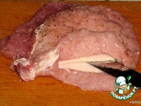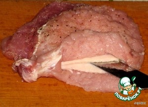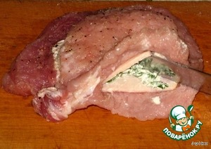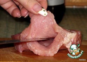 Сделать небольшой надрез с одной стороны куска мяса и прорезать внутри кармашек. |