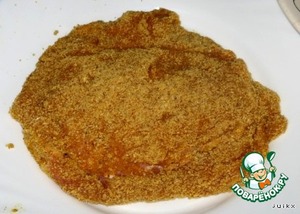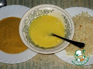 Подготовить панировку. Взбить яйца о одной тарелке, в другую насыпать панировочные сухари, а в третью положить мелко-мелко нарезанный батон (не очень свежий). |