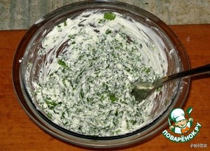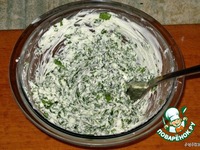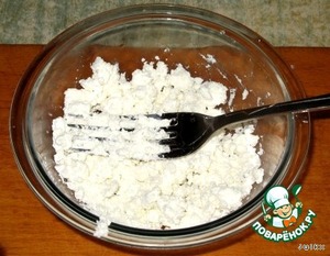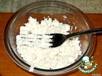 Разминаем в тарелочке сыр. Я использовала "Фету", хотя выбирала между "Фетой" и зернистым соленым. "Фета" оказалась пересоленной, но это не испортило вкус готового продукта. |