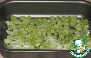 Ревень выкладываем в форму (для духовки), посыпаем сахаром и отправляем в нагретую духовку минут на 7-10 на не очень большую температуру.