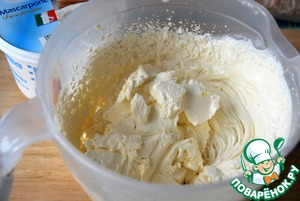 • Добавляем к взбитым сливкам маскарпоне и ещё раз всё тщательно взбиваем.