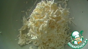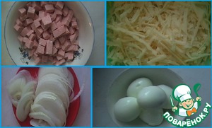 Измельчаем сваренные вкрутую яйца, трем на терке сыр, кубиками крошим колбасу и полукольцами режем лук.