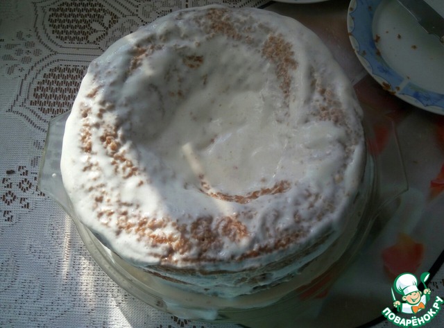 Крем я взял такой: сливочное масло + ряженка, отстоявшаяся ночь в марле + остатки меда (меньше ложки) + немного фруктозы. Большой ошибкой с моей стороны было пытаться сделать крем с маслом, потому как в моих условиях отсутствия миксера даже размягченное масло все равно осталось комками. Из-за ряженки и небольшого количества сахара крем вышел кисловатым, что, однако, всеми дегустаторами расценилось как плюс: если бы он тоже был сладким, то весь торт вышел бы слишком приторным. А так крем с легкой кислинкой оттенял избыточную сладость коржей.