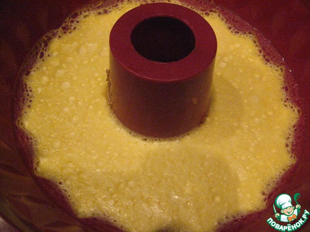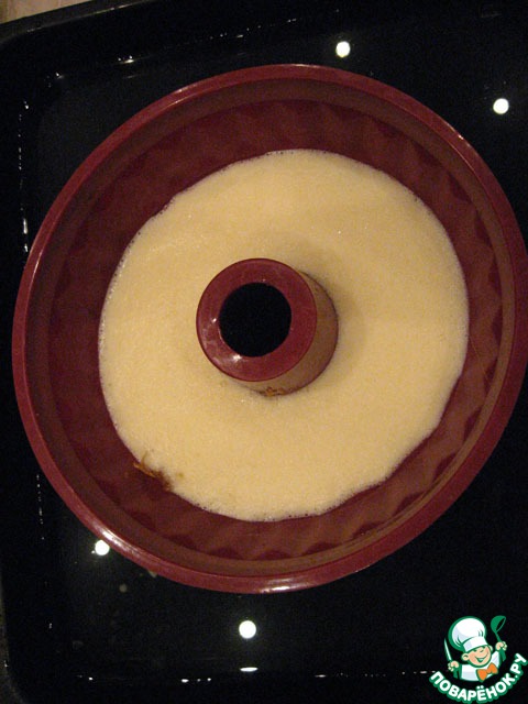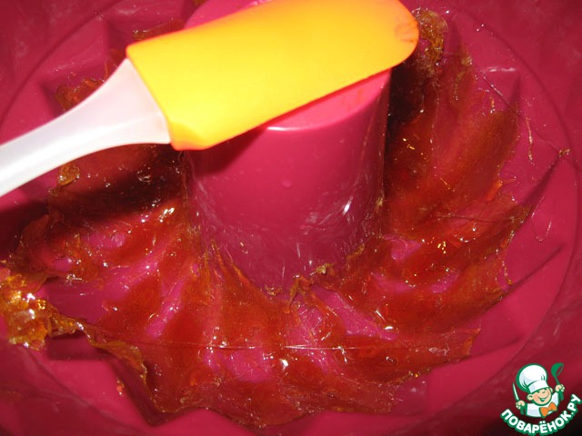 Наливаем карамель в форму и быстренько размазываем ее по стенках, нужно покрыть ею все стеночки. Оставляем форму в сторонке.
