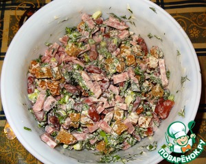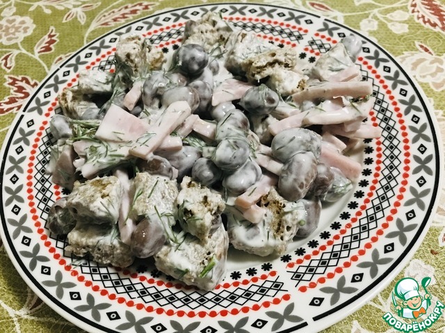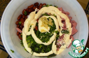 Фасоль промываем, ветчину режем кубиками, зелень меленько шинкуем, чеснок через пресс и все это чудо в салатник, заправляем майонезом.