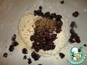 Хорошенько вмешайте начинку в тесто. Оно станет мягче и эластичнее. Если тесто начало чуть приставать к столу, немного присыпьте стол мукой, чтоб тесто вобрало ее в себя. Но тесто не должно получиться чересчур крутым. -