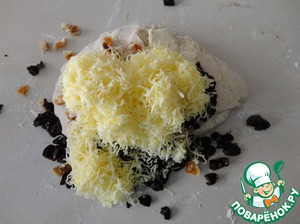 Во вторую часть теста мы замешиваем твердый сыр, инжир и оливки. Так же хорошенько вмешиваем начинку в тесто, как и в первый раз.