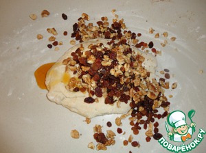 В третью часть мы добавляем изюм, грецкие орехи и мед. Здесь надо понимать, что мед будет липнуть к столу при вымешивании, и не переборщить с добавлением муки, чтобы не сделать тесто чересчур крутым.