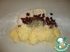 В четвертую часть теста мы добавим твердый сыр, вяленые томаты и базилик. Вымешиваем тесто.
