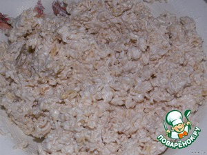 Добавить к вермишели 3 ст. л. майонеза и 3 ст. л. сметаны, размешать и оставить на 30 минут.