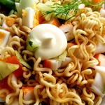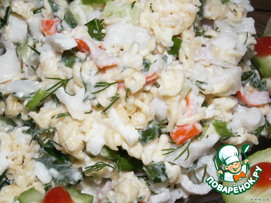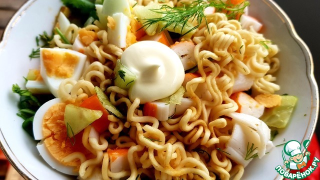 Знаю, что такая лапша не полезна. Но иногда можно поесть и такой салат.